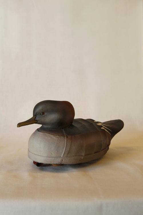 Last issue, we followed Charles Holloman as he worked on a canvas merganser decoy. To pick up where we left off, the decoy’s wire-and-wood frame is ready to be covered with canvas. Charles likes to use the light pillow ticking available at material stores and department stores to cover his birds because the lines in the material help him keep the bird symmetrical as he stretches out the canvas.