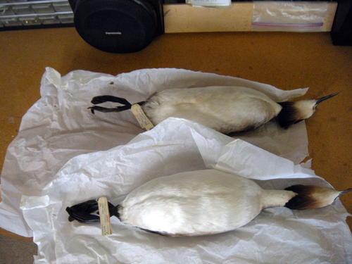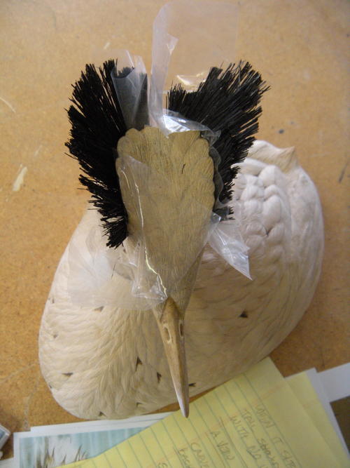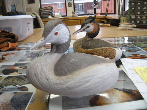 These are the two great crested grebe study skins on loan from the Carnegie Museum of Natural History. When using study skins for measurements, I always adjust for shrinkage. Try to determine the age of the skin, as this will affect the color and shape of the feathers. When making patterns, I use the measurement of the culmen—the upper ridge of the beak—to get the size right.