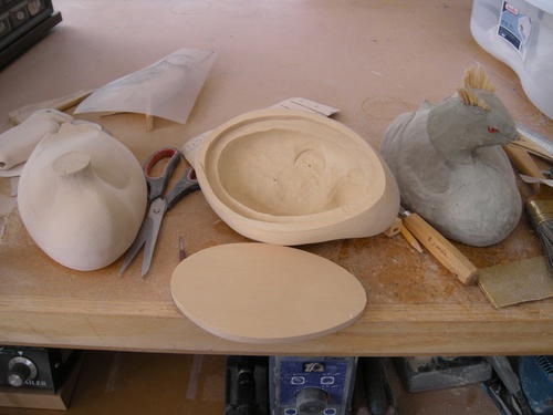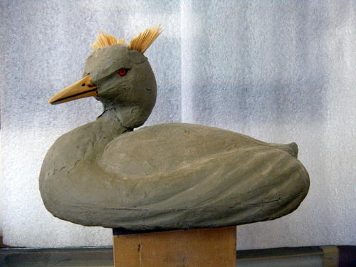 When I do a clay model, I rough carve a bill and use glass eyes to help me to see the details that would normally take hours to create. I quickly carve a very small body, neck, and head to act as an armature for the clay. This model is sitting on a turn table so that I can look at her from all angles.