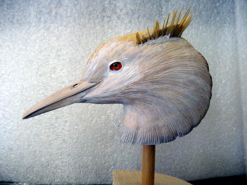 I am always in a hurry to get into the wood and get some carving done, and this has always been a problem for me. This time, I took the time to make a clay model of the bird. I also did a life-size carving of the head, showing the crest, and attempting a paint job that would draw attention. I did not like this first crest, which I made from crushed bamboo hardened with superglue. It was too brittle. For my second effort, I tried the reeds used for basket making. They were flexible and had the look I wanted.