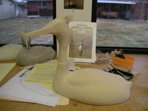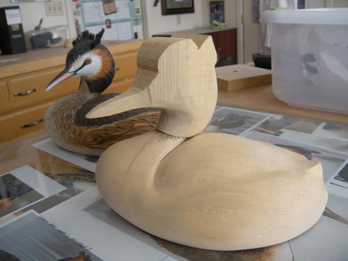 For the head and body, I used two pieces of jelutong. I’ve hollowed the neck area on the head to receive the neck from the body. In the background, you can see my first effort in carving the female great crested grebe. The plastic tub on the work bench holds the two study skins. I also have a glass top on my mobile work bench, where I store the reference photos of the bird on which I am working.