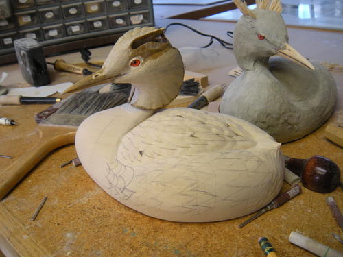 Early in 2012, I learned that the pair competition at the 2014 Ward World Championship would be grebes. I have had some success with my grebe carvings in the past and knew this was something I had to do. At first, I wanted to do a pair of pied-billed grebes, an adult female, and a juvenile male. I got busy and carved three juvenile birds, critiquing each before moving on to the next. I planned to enter my fourth effort. Then the photographer who had been supplying me with reference photos sent me a picture he had received from Europe. It was of an adult great crested grebe. That was all it took for me to change course. The bird was beautiful! I had to do a pair.