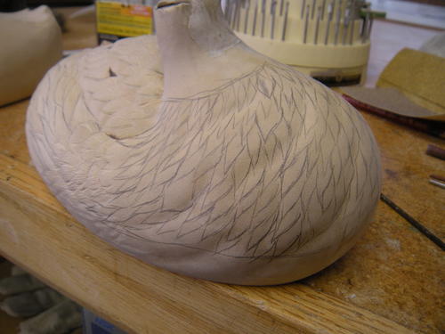 I have carved the side pocket feathers on the 8 right side. I keep going back to my reference photos to try to make this area realistic and interesting. I have drawn in the feathers on the breast. Notice that three of them are double the size of the others; again, I am trying to add more interest.