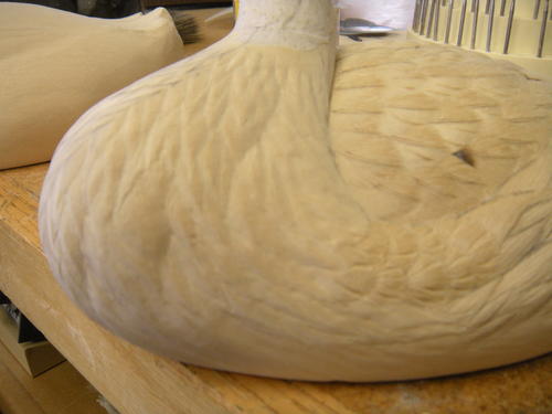 When carving the breast feathers, I not only change the size of the feathers, but I also vary the depth of the feather groups. Notice how the wet feathers change shapes where the breast meets the side pockets, going from a dry looking feather to a wet feather.