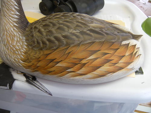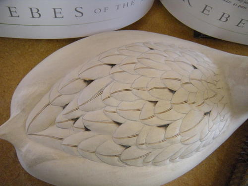 For the side pockets, I studied all the photos that I could gather to make sure the feathers looked like they were wet. On all the grebe carvings I have seen, except one, these feathers had been treated to look like duck feathers. That is not what my references show.