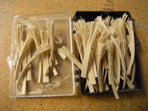 This is my box of magic! I went through three different types of wood and treated them in four different ways to come up with a natural shape, flexibility, and strength that could duplicate the crest on this bird. I tried to paint them, but this only made them brittle. I ended up staining them with leather dye to give them the look and flexibility I wanted.