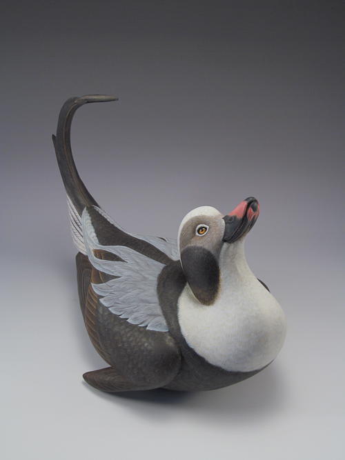 Liquitex Gesso is my preferred primer. I find it adheres well to the sealed surface, dries to a matte finish, and leaves no brush marks when thinned with a small amount of water. After several thin coats, the surface is one solid color, and will be slightly absorbent. Other brands of gesso seem very plastic-like in nature, and not absorbent. The one time I tried that type of gesso, it began peeling off the sealed surface within months. I use both white and black gesso, depending on the project. Starting from a solid black surface lends itself well to the long-tailed duck. I thin the gesso with water, to avoid brush marks. Use only enough water to make sure your brush strokes are not visible once the surface dries. If you add too much water, the gesso beads up on the sealed surface. It takes at least two to three coats to completely cover the surface so it is solid black, with no wood showing though.