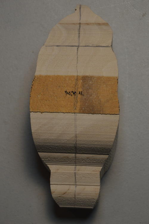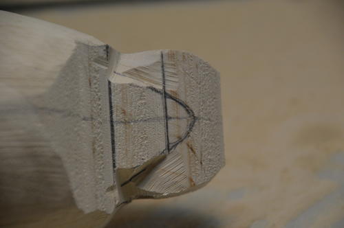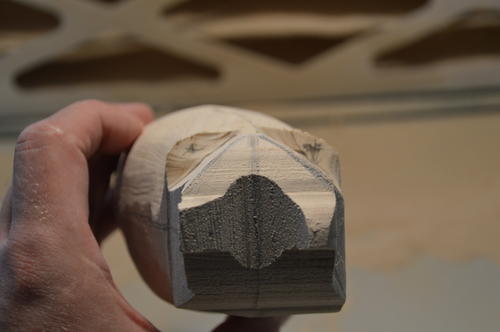 I’m still using the coarse sanding drum, which is a great tool for removing wood. I’ve sanded away the areas indicated in the previous photo.