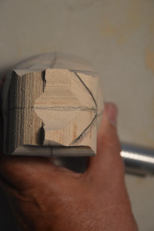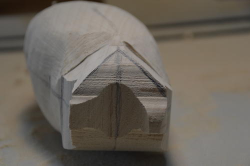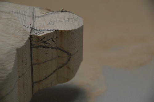 I’ve begun rounding, using a coarse sanding drum. Be careful not to remove wood from the tail at this point.