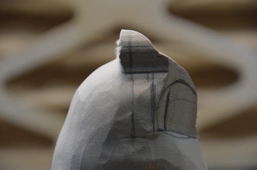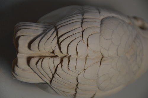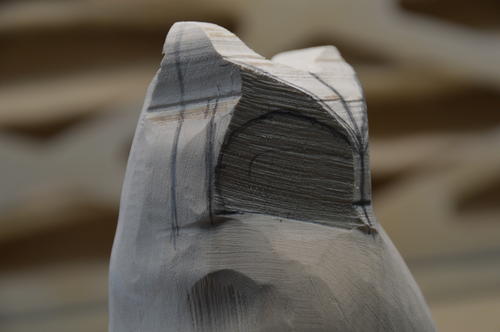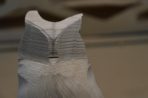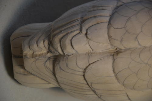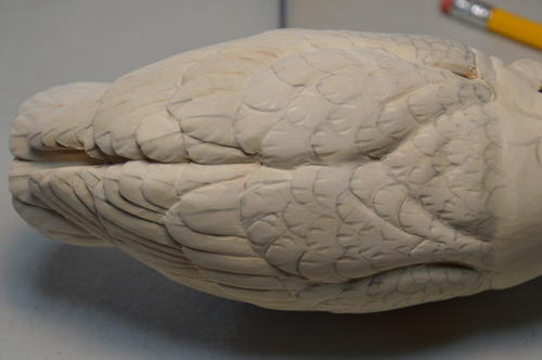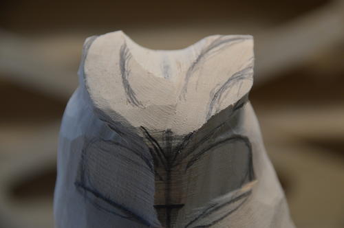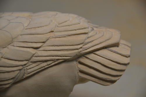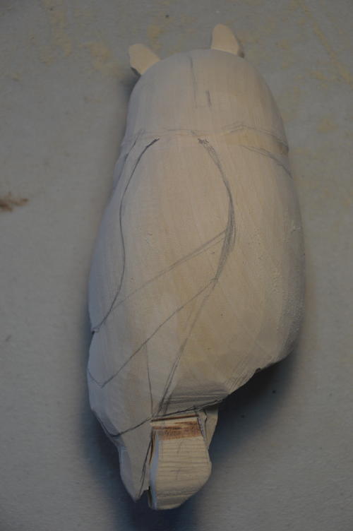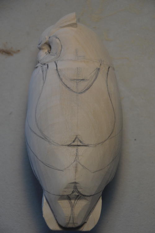 I’ve finished rounding the entire body, using the fine sanding drum. I can now pencil in all the feather groups.