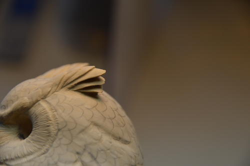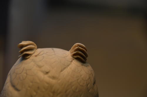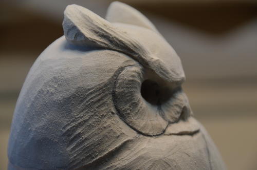 This series of photos shows how I textured the facial disk with a red ceramic stick, defined the ear tufts with the fine diamond pointed flame, and burnished the feathers on the back of the head.