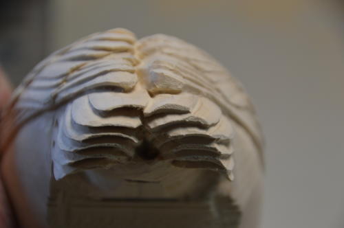 Now I’ve switched to a fine sanding mandrel to round off the back of the head, seen here from the back and profile.