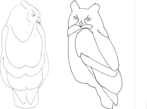 The owl has such a distinctive face, and it’s important to pay close attention here. I’ve sketched on the facial disk and the ear tufts. Note that both ear tufts are flowing in the same direction. I’ve done this to introduce the external force of the wind into the finished project.