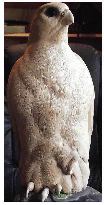 Although I have carved many species of falcons and other raptors, this is my first prairie falcon. I wanted to capture the bird's alertness and intelligence yet maintain a fairly simple pose. By raising the foot, I gave this piece a more regal feel and added extra character to this beautiful bird.