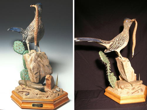 I tried my hand at carving a Miniature Roadrunner with a skull as habitat. I was happy with results. See attached photos. Ed Fox