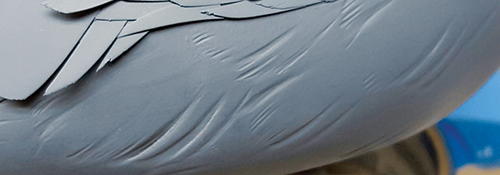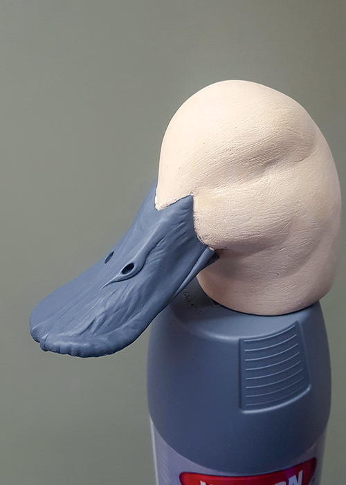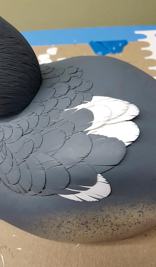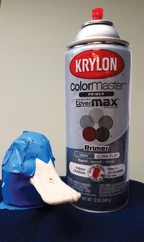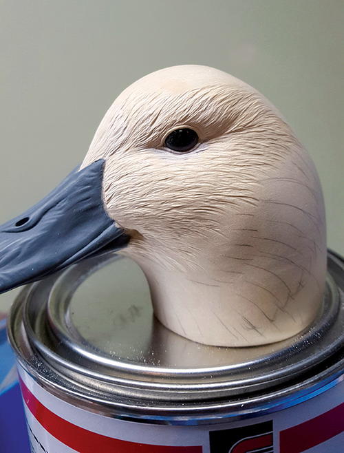I’ve detailed the bill with wrinkles and shaped it to match my study bill. With a ruddy, I make the bill just a touch oversized and give them that curved-up look these ducks have. I take blue 2" painter’s tape to mask the head (A). When I remove the tape, the bill will stand out. I can modify the head shape to complement the bill in case it doesn’t line up. I use Krylon primer. I have tried other brands, but Krylon is the best for my method. I like dark gray because all imperfections easily show on dark surfaces. This particular primer is also a sealer. It dries in minutes and sands well. I apply five to seven coats, using steel wool between coats (B). Be sure to blow off any metal particles before applying the primer. As you can see, there are no sanding marks—the bill is super smooth and the wrinkles look natural (C). It is imperative that you have a smooth surface before you paint, otherwise imperfections will show through the paint no matter how good you are. This applies to the body, too.
