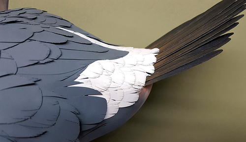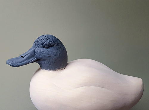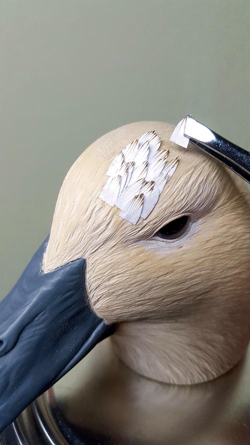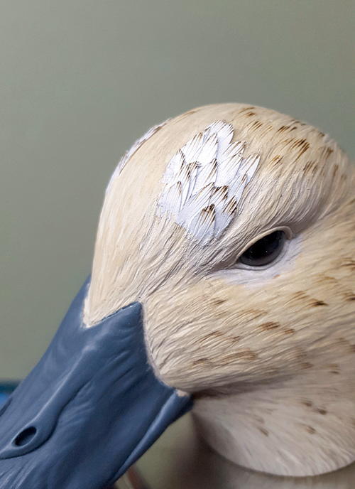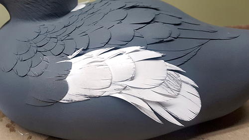 My decorative decoys have always been extremely detailed, with every feather carved and burned. As my painting improved over the years, my long hours of burning and carving came to an end once I learned how to create the same appearance of real feathers with paint. My latest technique, which uses inserted “paper” feathers, requires minimal texturing, burning, and carving.