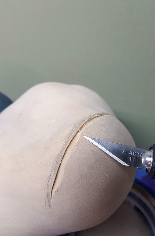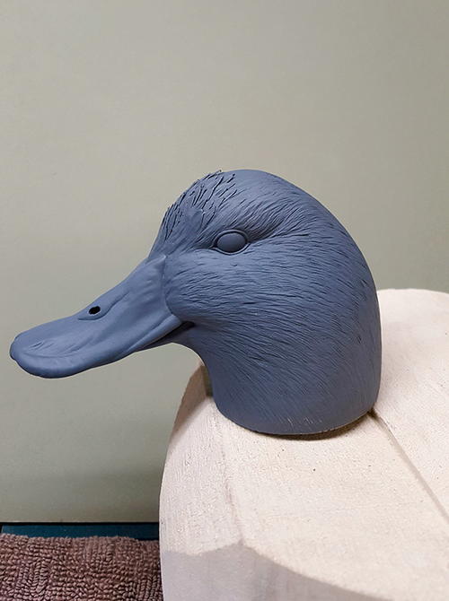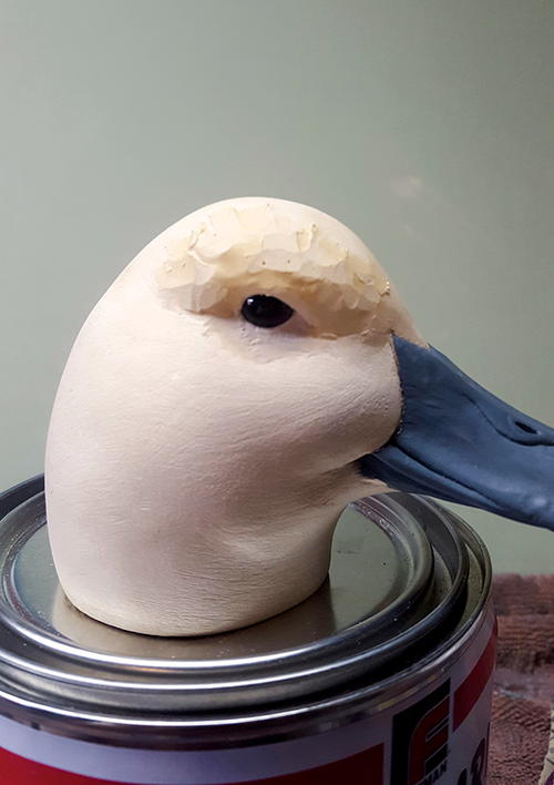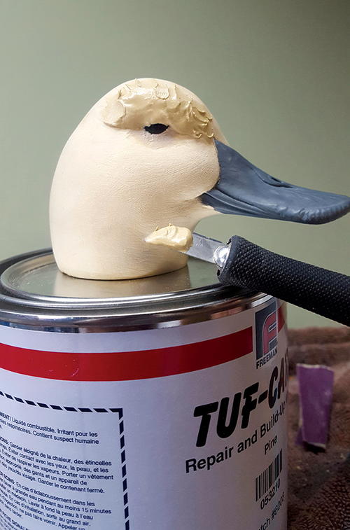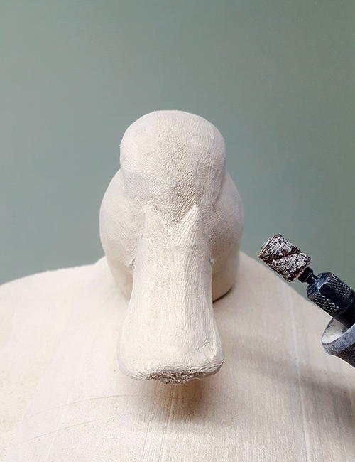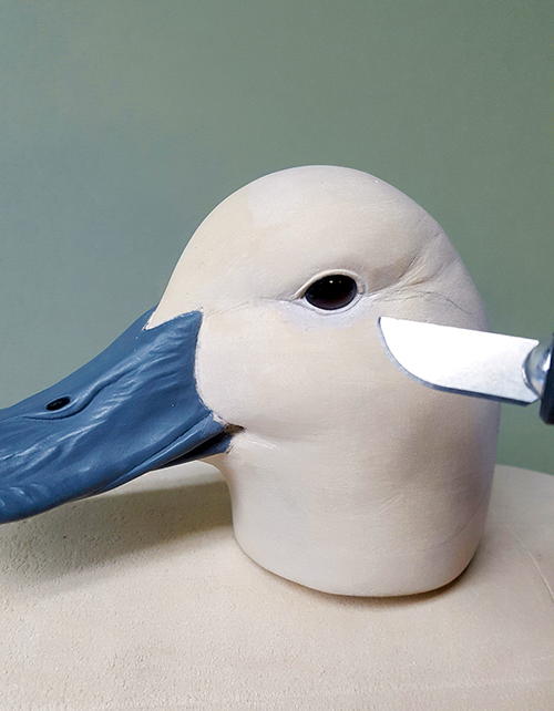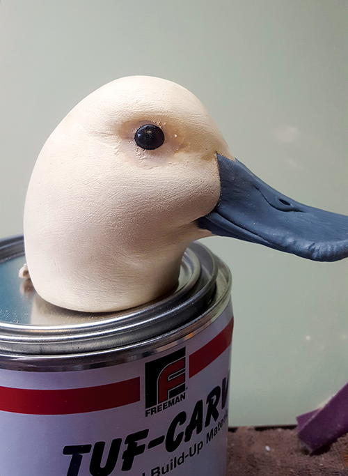 First, round the body. I won’t go into too much detail on the body, other than to say it’s the same process as the head. Think round. The head is now ready to be attached. Since this is a decorative floater and will be handled with care, I will not use a dowel to attach the head. I use a fair amount of TUF-Carv on the neck joint (A). TUF-Carv is also an epoxy, so the head will be permanently attached. Press down on the head enough so that the filler oozes out, assuring that the neck joint is completely filled with no voids. While the joint is still wet, I take my knife and spread the excess, blending it to the body (B). When it’s dry, sand and shape the neck joint and add texture. When painted, the neck joint will not be visible, especially on a semi-low head position.