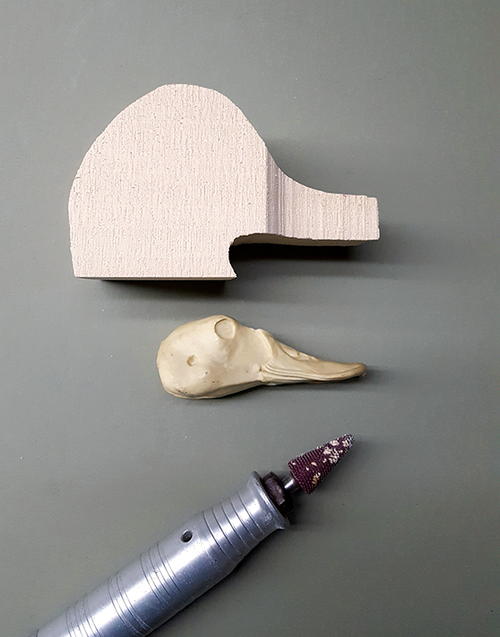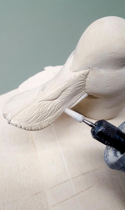 Here the bill (with my study bill) is shaped and ready for detail (A). Before beginning the detailing process, I use 320-grit sandpaper to eliminate all rough areas and grinding marks from the Dremel (B). I use a 1⁄32" cylinder bit to create wrinkles (C). I make them really deep. Once the detailed bill is ready, I will use primer to fill the wrinkles, leaving a flawless, smooth texture. After placing the wrinkles, I switch to a ball bit (D).