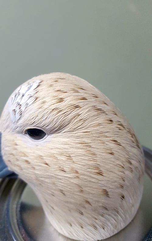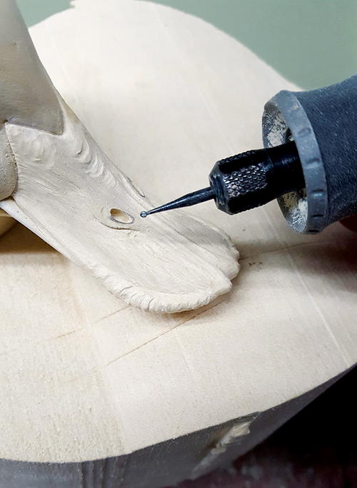 It’s a good idea to keep your bird clean throughout the whole process. Use correct measurements, keep your feathers clean, remove deep sanding scratches, keep the surface free of debris, avoid flat spots, and keep your burn lines parallel. If you don’t do these things it will affect your painting down the road. Always think clean! For example, the first thing I look at in a carving is the bill. There’s nothing worse than seeing uneven nostrils, sanding marks, and a caked-on paint job with a high-gloss finish.