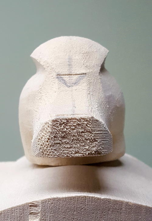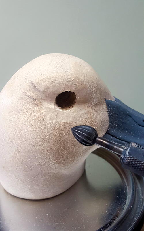 This gets rid of any sharp lines and creates a soft texture. I now shape the nostrils and make the nostril openings with a micro ball cutter (E). Be very careful not to hit the edges of the openings. If you do, you can use TUF-Carv repair paste to reshape them.