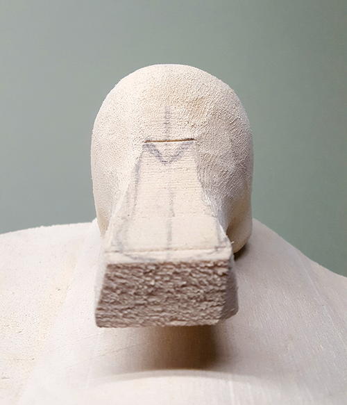 When I begin the head (A), I’m always thinking “round.” I draw a centerline right down the top of the head to help keep it symmetrical. I use a Foredom tool with a cutter bit to remove major portions of wood rapidly. I do all fine detail with a Dremel tool.