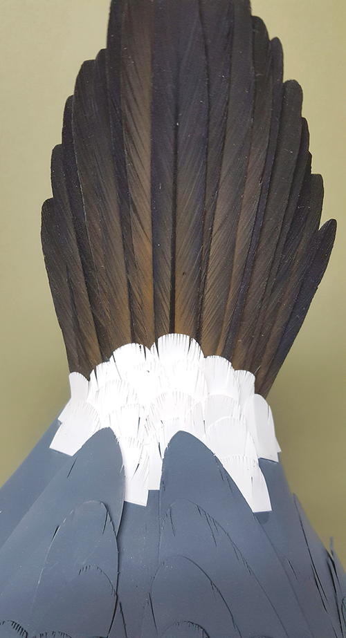 This is the same process as the head, using sheets of standard white copy paper (A). Draw your feathers and cut out with scissors. I use a standard #11 X-Acto blade to cut feather splits on each feather (B). I burn them and prime each side to waterproof them, especially on the side pockets close to the waterline (C). Before inserting feathers, I prime the entire body with Krylon primer. For added security, add extra coats of primer on the lower half of body, which will be underwater. When adding feathers, I work from the front to the back. Dab some glue on the front edge of each paper feather. Do not cover the entire feather with glue. You want room to tuck the next feather under, with enough play for adjustment (D). I recommend drawing in your feather groups as a guide. If you make a mistake, you will have to tear off the feathers. As you create feather groups, be sure to prime as you go (E). This helps me view each group, making sure that they all have a natural flow (F).