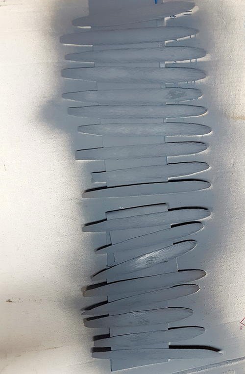 For the tail feathers, I use maple veneer (A and B). It’s super thin and strong. I shape, burn, and prime each feather (C and D). I paint before inserting them (E). Better to do it now than later. If you insert them before painting, it will be much harder to paint them. A ruddy has 18 tail feathers. I often see ruddy carvings that do not have enough tail feathers, which is a big mistake.