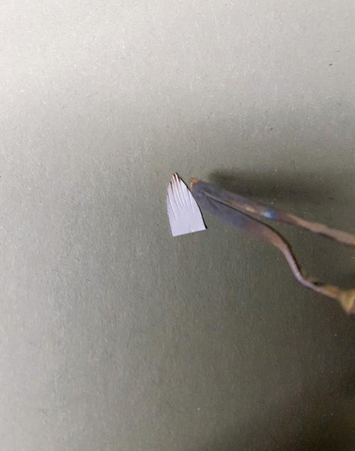 I use a 1⁄32" cylinder Dremel bit to texture the entire head. I begin at the front and work my way back (A). I draw in some guidelines with my pencil and create feather groups. At the front, the feathers are small but they gradually get bigger as you continue toward the back. This texturing will require some practice. I curve each line that I texture, creating a soft texture effect (B). Once the entire head is textured, I begin the paper feather process. I use standard white copy paper (C). Draw in your tiny head feathers and use scissors to cut out each one (D). I use a stack of three sheets to help speed up the process. Cut as many as you need. Once I’ve cut out the feathers I burn each one (E). Paper burns just like wood. Burn at a #4 or a temperature that doesn’t overheat the paper. I keep a piece of 320-grit sandpaper handy to sharpen my burning blade. When you’ve burned enough feathers, you can glue them into place with CA glue. You will need tweezers to insert each feather and help keep the glue off your fingers (F). I begin in the front and work my way back. I want only a few feathers on the crown, but it’s entirely up to you on how many. To glue, add just a dab and only on the front edge of each feather. Do not cover the entire feather with glue, and do not overload. You do not want glue seeping through and creating a mess. Press and hold for a few minutes and then insert the following feather underneath and repeat the process. Make sure to stagger your feathers and avoid that fish-scale look. Overlap them and create small feather groups.