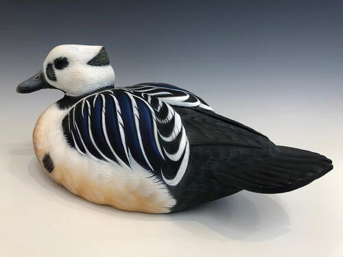 If a carver can have a “signature bird,” then the Steller’s eider is mine. It was the first bird I entered in competition and its image graces my business cards, letterhead, and mailing labels. Nonetheless, few carvers tackle this species. In all honesty, I can think of only about half a dozen credible carvings of this magnificent bird, so let us see if I can pique your interest.