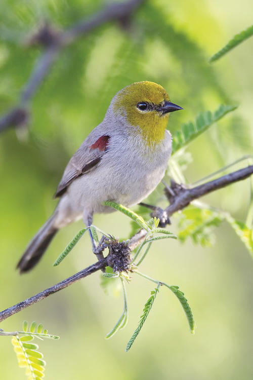 The Verdin (Auriparus flaviceps) is a tiny bird that measures between 4 and 4½ inches in length. It has a short, pointed bill and a short tail, with a yellow head and a reddish-brown shoulder patch. You can spot the verdin at the ends of thorny bushes in the dry county of the Southwest. It builds a surprisingly large nest for such a small bird.