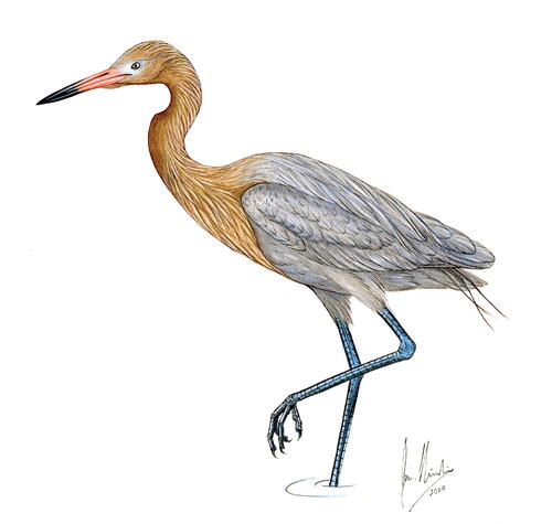 Don’t let the name fool you. Most reddish egrets have cinnamon-colored feathers on their head and neck and a slate-gray body, but they also come in a striking white-feathered version. Both morphs have pink bills with black tips and legs that are sky blue on the back and sides and jet black on the front.
