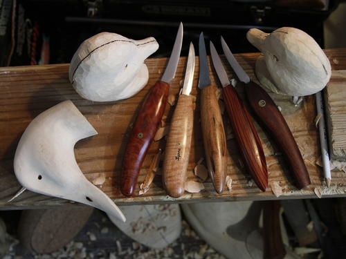 In the first part of this article (Winter 2016), I discussed how custom knives are manufactured and demonstrated the basic cuts. In this part, I’ll share the viewpoints of several top carvers. I had my work cut out for me (pun intended) trying to find bird carvers who use knives. Most of the ones I approached use Foredom tools to remove the bulk wood and some micromotor tool for fine detail. All the carvers I interviewed agreed that knives usually offer better control of the amount of wood you remove. It also is a more relaxing carving method, and is obviously a lot quieter than running a power grinder.
