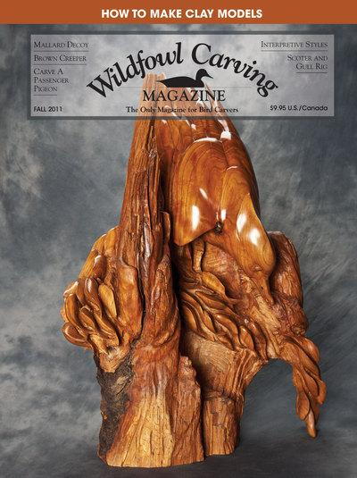 Discover the metamorphosis of a log of cherry wood into a merganser in action in this Fall 2011 issue of Wildfowl Carving Magazine. In addition, admire how Dave Harmon turns a bullying gull and his two scoter targets into a cohesive rig, while Jerry Simchuk uses clay to plan out and solidify his inspirations before carving. Finally, don't miss the brown creeper reference article on little songbirds whose name sounds much spookier than they really are.