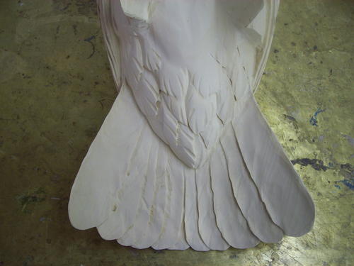 Still using the sanding mandrel, I begin to add definition of the major feather groups.