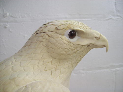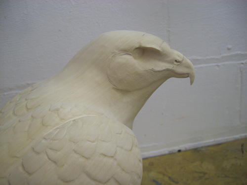 In the previous photo, you could see how I cut in the tail feathers. By this step, I used a burner to create some spacing between them. I’ve also carved in the head. It is of the utmost importance that you have excellent reference material for the face.