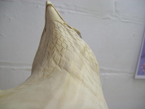 You can now see how I’ve added the head feathers. I did this using the back end of a burner and then rounded off the edges with sandpaper. Take note of the feather flow.