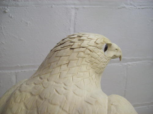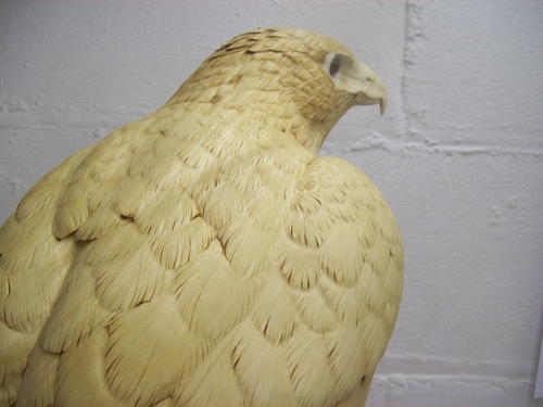 My fascination with the red-tailed hawk began during my apprentice years as a falconer. Up close and personal, this magnificent creature never fails to amaze me. The red-tailed hawk gets little respect in the raptor world, yet it has a tremendous amount of power, beauty, and grace. I created the piece in this article for a fellow falconer. It is a life-size replica of his former hawk (Catch). After several years of hunting with his feathered partner, the owner released the bird back into the wild. The carving brings back fond memories of this graceful hunter.
