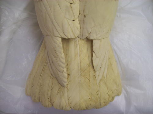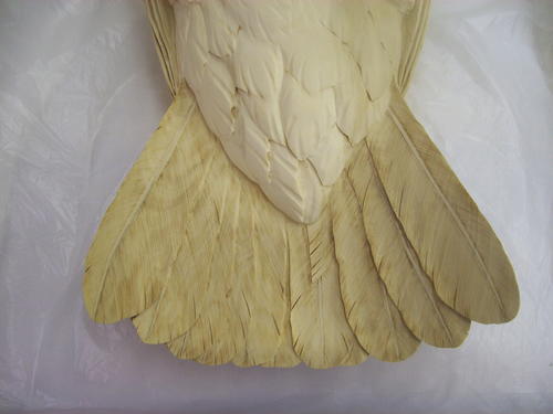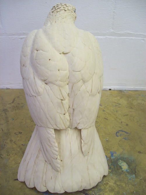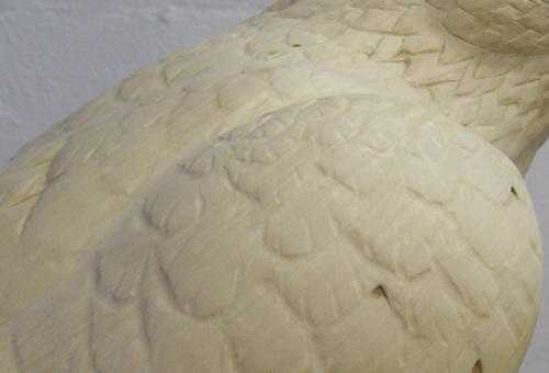 This back view shows how the bird looks after I’ve done fine sanding and shaping. I’ve added the quills of the major feather groups. I used a flat (Guge) burner and then sanded them.