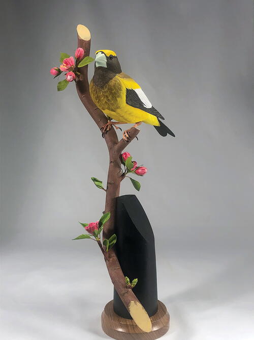 The flashy colors of the male evening grosbeak should not intimidate even a novice carver. Not a lot of color mixing is required to get a realistic result. The separation between the colors on most of the grosbeak is fairly distinct, with only a few areas requiring blending where two colors meet. Two of these areas are the back/upper-tail coverts, where the colors blend from yellow to black, and on the cape/scapulars and breast, where the greenish brown fades to yellow. Otherwise, the colors mostly follow entire feather groups. One exception is the white wing patches, where some feathers of the secondaries and greater coverts are both white and black.