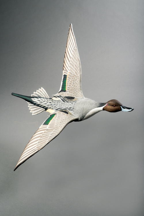 I began the project by doing some research and gathering good photos of pintails in flight. The natural bend of the main frond forming the body made me think about portraying the bird moving fast but also starting to bank into a hard turn. Rather than having the wings and tail cupped for a landing, I decided to have them maneuvering through the turn. Once I had guideline dimensions, I developed patterns for the wings, tail, neck, and head. I would carve the neck and head from tupelo. The rest of the carving would be all frond.