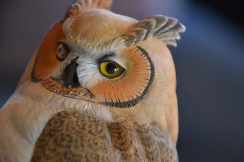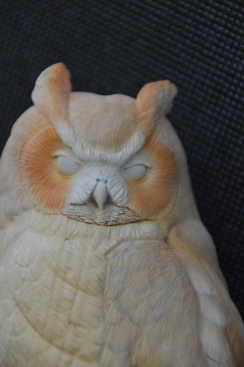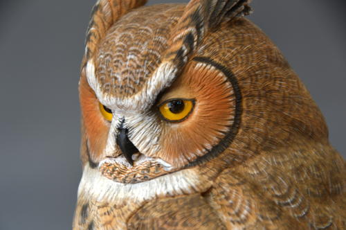 Now I begin to detail the face. I get the white of the moustache with individual brush strokes, and I have painted the outer half of the ear tufts with the base brown, as well as barring the inner half of the ear tufts. The tiny feathers under the bleak have been painted as well. I first base coated them by airbrush with the orange mix, then hand brushed the warm black through the center of the feathers and edged them with white.