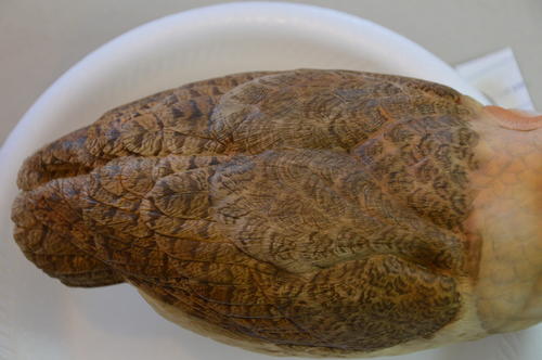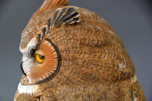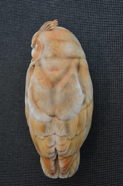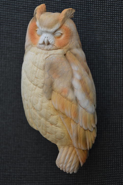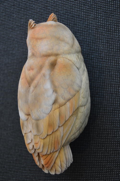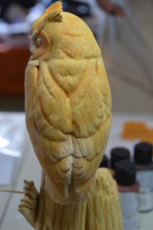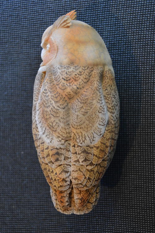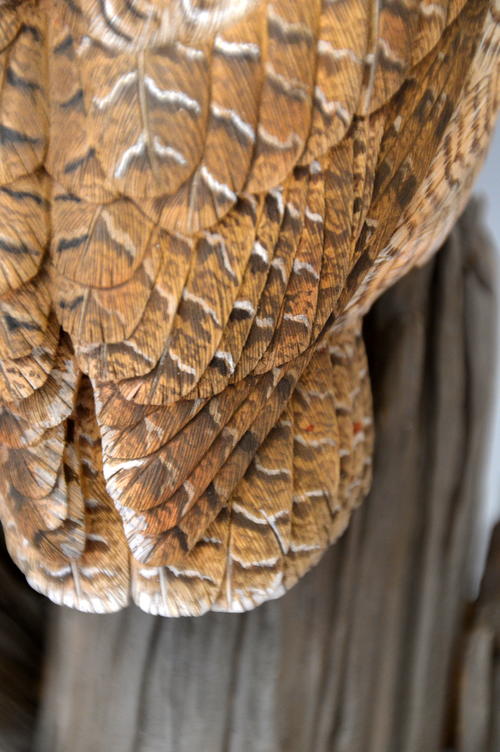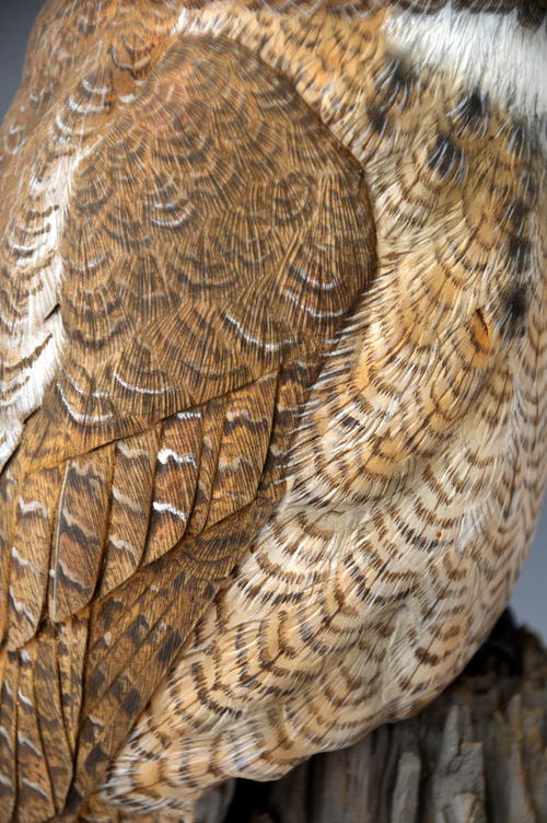 The next series of photos shows the darkening or shadowing of areas. I especially like to hit the valleys and creases that I’ve carved into the bird. The color used for this is a dark brown. Again, I am not concerned about an exact color. The mix I used was a blend of 70% raw umber and 30% burnt umber. This is achieved with the airbrush.