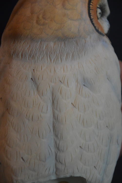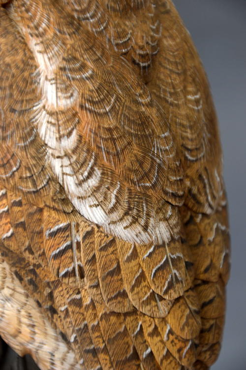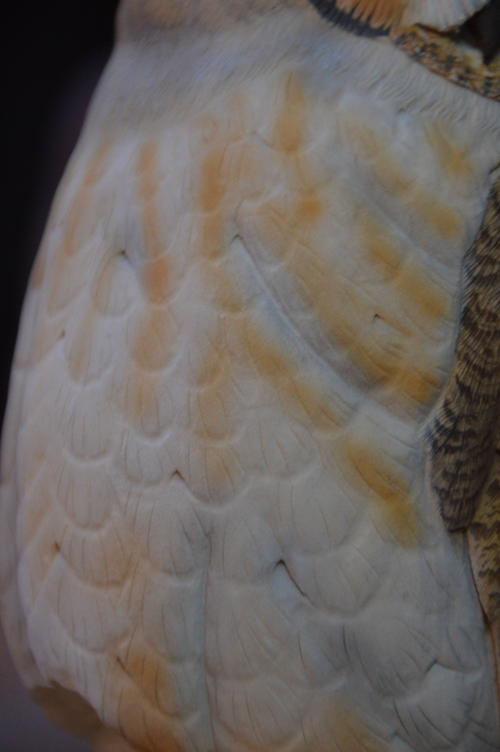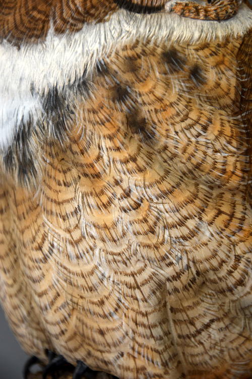 This series shows the details of the finished breast and belly area. Once again, it took me many hours of painstaking work with single brush strokes of whites and browns. On the throat area, I applied a base coat of medium gray (a blend of white and black) with the airbrush. Then, many strokes of titanium white over the gray created the translucent effect.