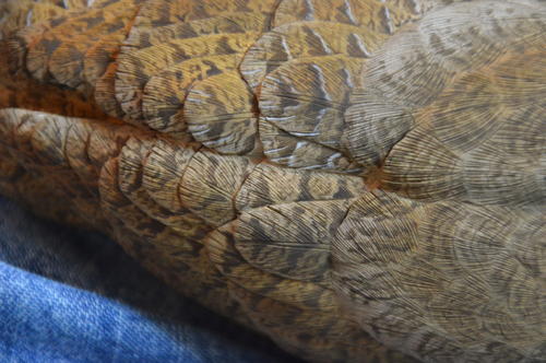 I now use the base orange. Checking my reference, I lightly air brush the center of the feathers,