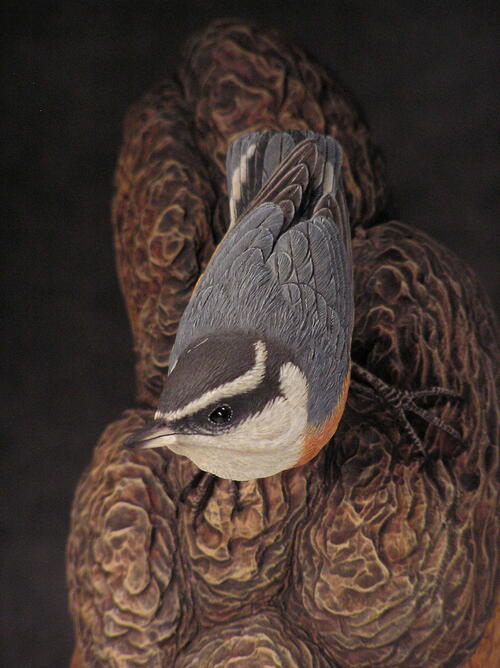 When most wildfowl carvers embark on a new project, they think primarily about the bird. It is just as important, though, to consider the habitat. The habitat gives the viewer a sense of place and setting and can be just as important as painting in making the piece come to life. Habitat helps your sculpture tell a story. Keep that in mind when you decide on the habitat for your carving. For the habitat and presentation for this project, I wanted to portray a red-breasted nuthatch the way I used to see the birds every day out my window. They would go down and around the pine trees, looking up from time to time as they searched for bugs in the bark.
