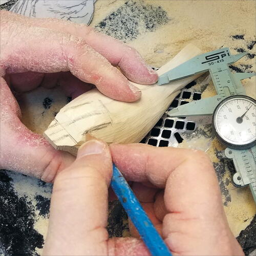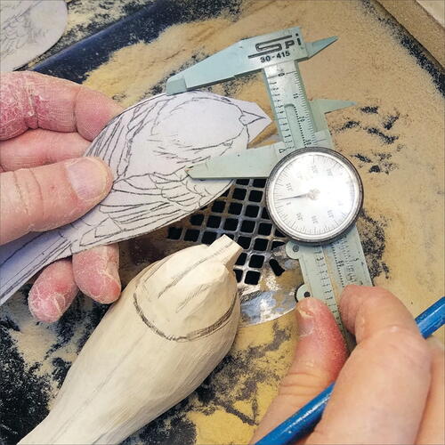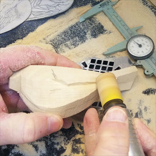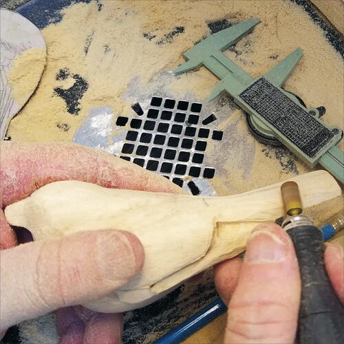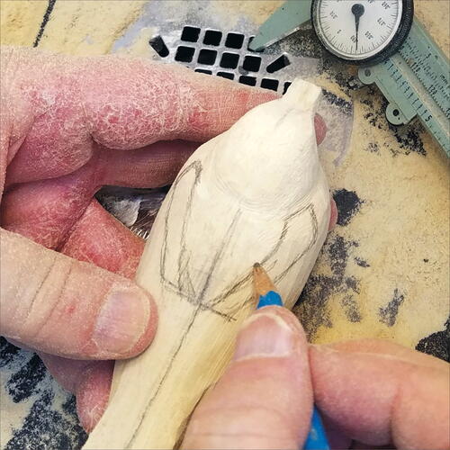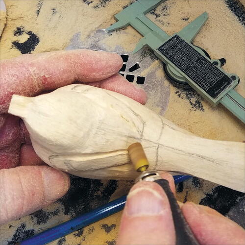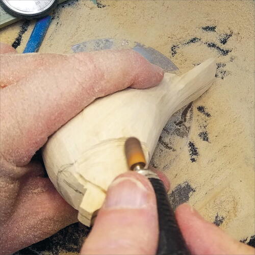On the pattern, measure the location of the lower rump and draw its location on the blank. Using a fine, flat-top Saburrtooth burr, carve out this area. Keep in mind that you are also carving out the underside of the wings at the same time. Be careful to not over carve your wing area.
