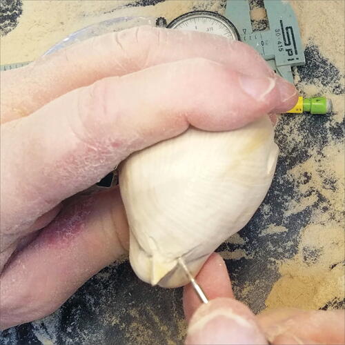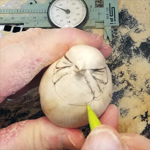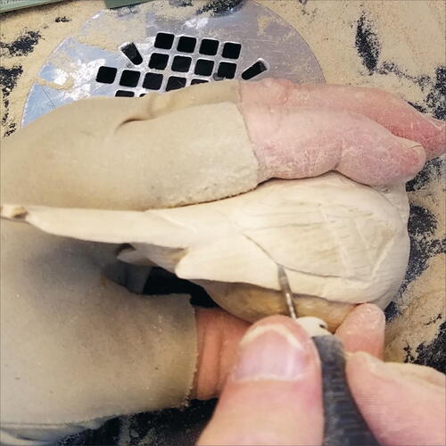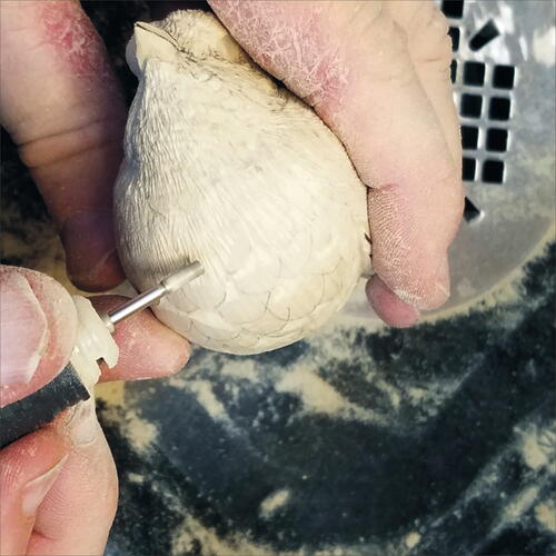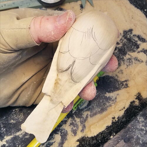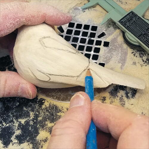 With a pencil, draw out the edges of the wings on both sides, and then take your micro-motor device and carve down on the flank side of the bird to expose the wing area. Do this on both sides.