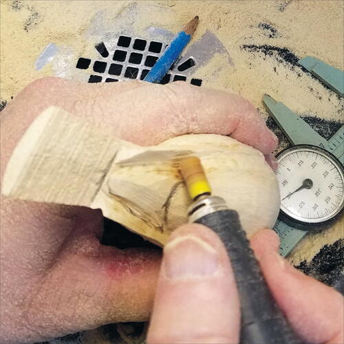 Working with a white stone about 1/8" thick, begin texturing the carving feather by feather. Working against rotation helps the tip dig into the wood, while working with rotation allows a quick, cleanly etched line.
