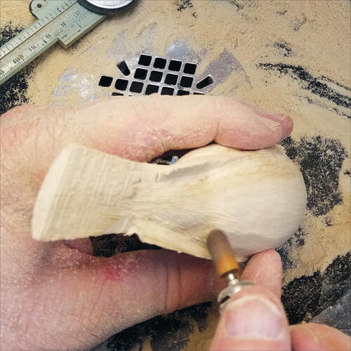 Use a round-top, fine Saburrtooth burr to begin carving out the neck from the head side of the neckline. Also carve out the basic shape of the beak area.